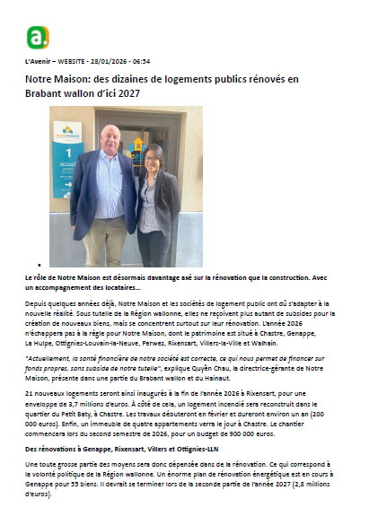 Des dizaines de logements rénovés d’ici 2027 : Notre Maison passe à la vitesse supérieure Notre Maison intensifie ses projets de rénovation énergétique en Brabant wallon. Plusieurs centaines de logements seront concernés dans les prochaines années, avec un objectif clair : améliorer le confort, réduire les charges et accompagner les locataires tout au long du processus. Au-delà des chiffres et des chantiers, c’est une véritable accompagnement social qui est mis en place, grâce à la référérente technico-social avant, pendant et après les travaux.